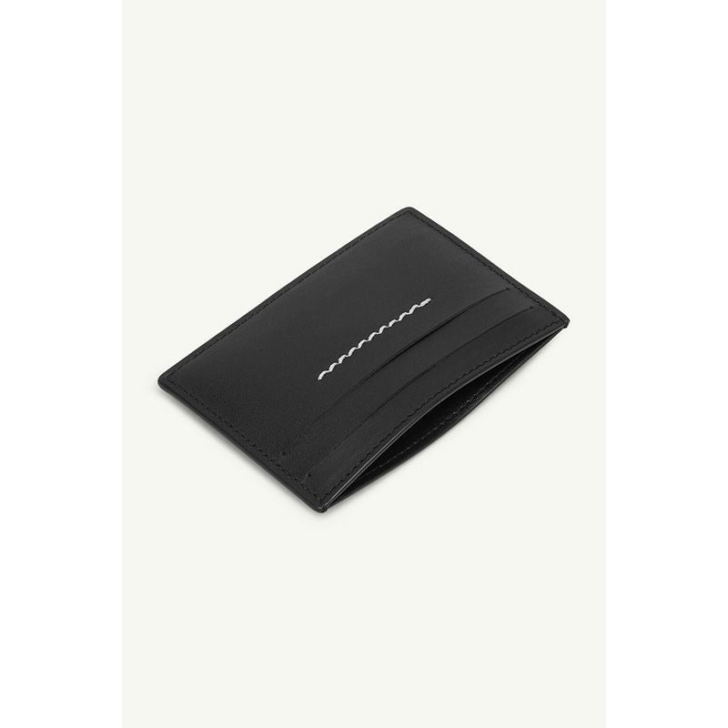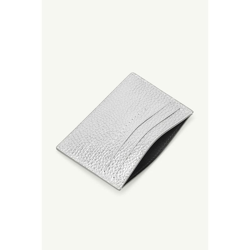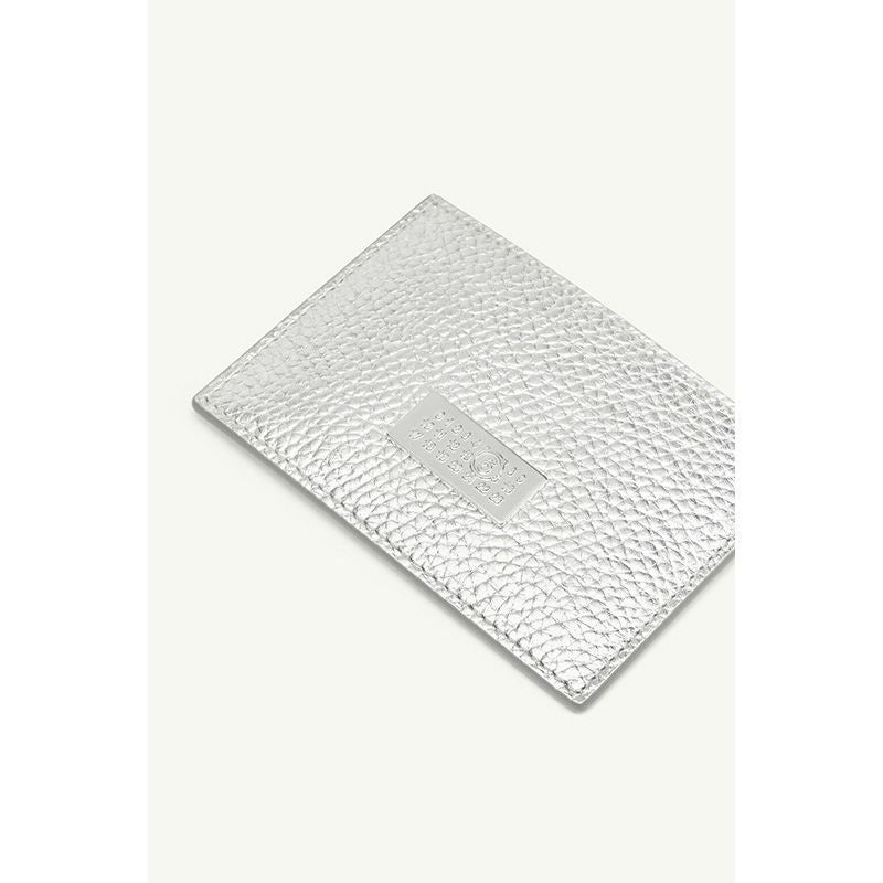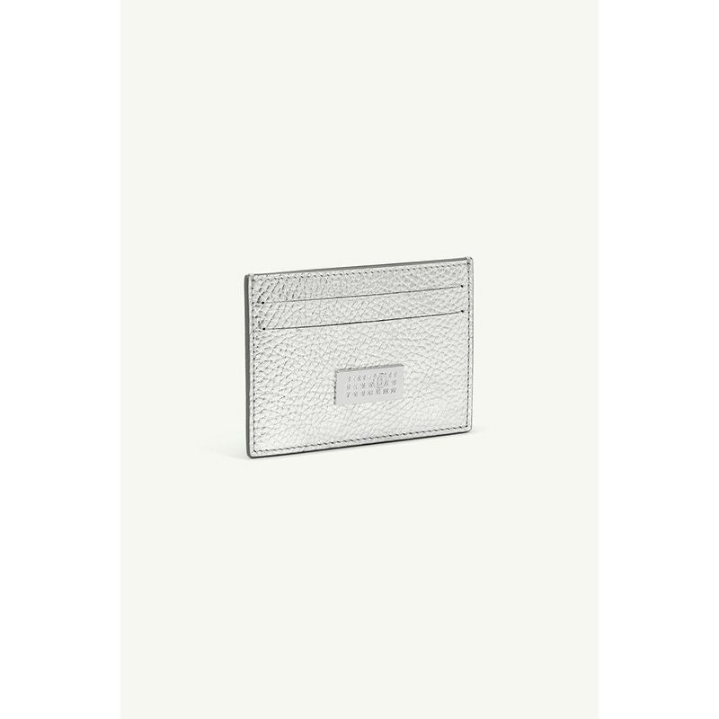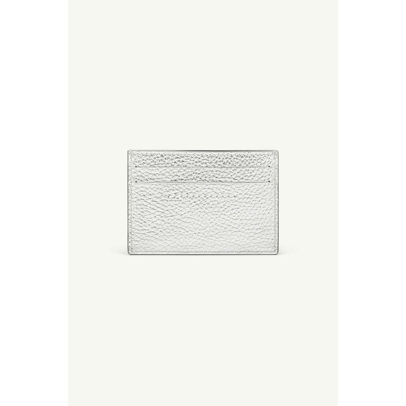 構造と輝きが調和した、メタリックシルバーのグレインレザー製カードホルダー。反射するナンバリングプレートがミニマルなフォルムを引き立てています。フロントとバックに2つずつ配置されたカードスロットが実用性を高め、バックの白いステッチラインがメゾンの独自性を強調しています。