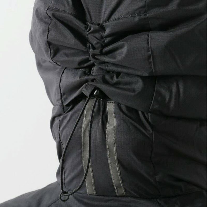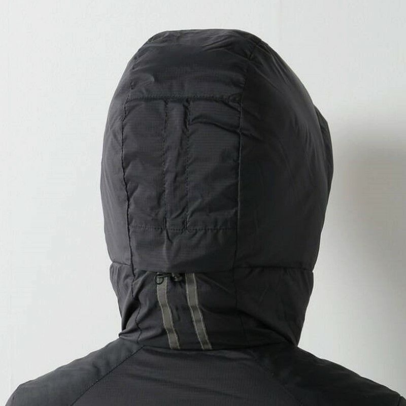 フロントにあるコードでフダウンフードのフィット感を調節できます。保温性、雨風からの保護力が向上しています。