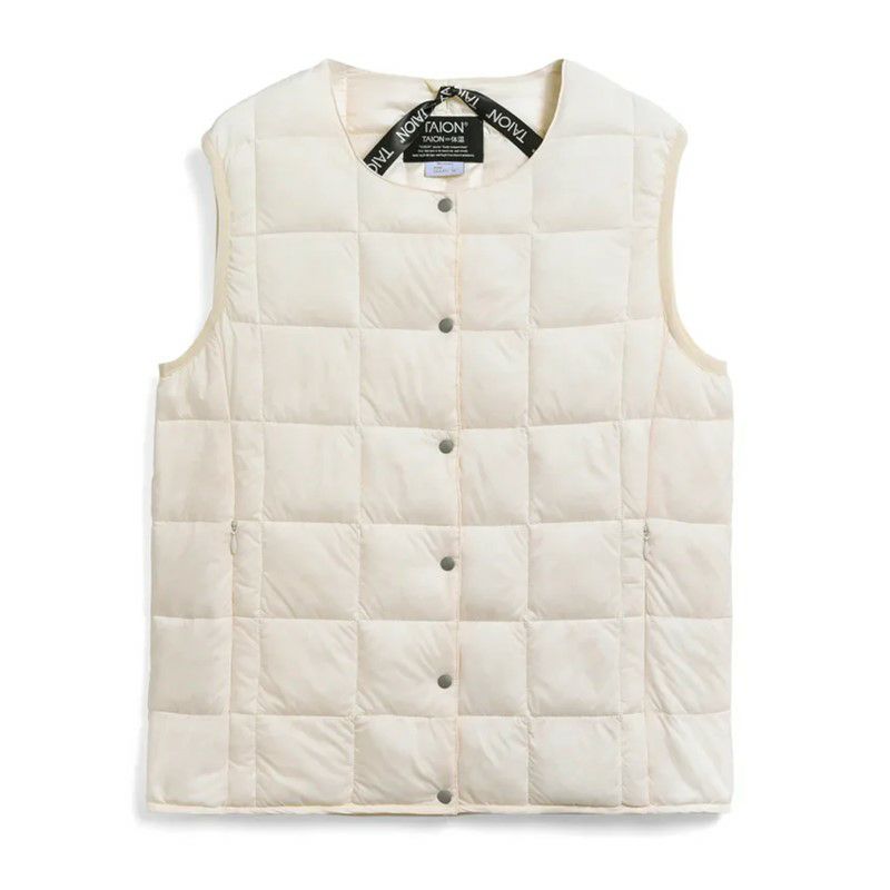 TAIONの定番、ベーシックインナーダウンは、ジャケットやコートの下に着るのはもちろん、Tシャツ・シャツ・パーカーなどの上にも気軽に羽織れる、軽くて暖かく着回しやすいシンプルなデザインが特徴。