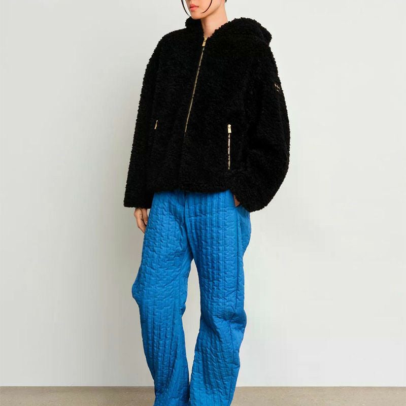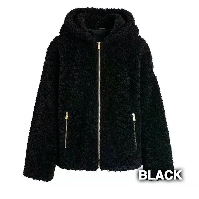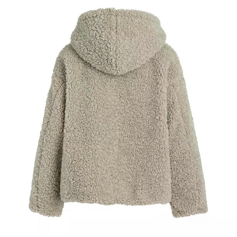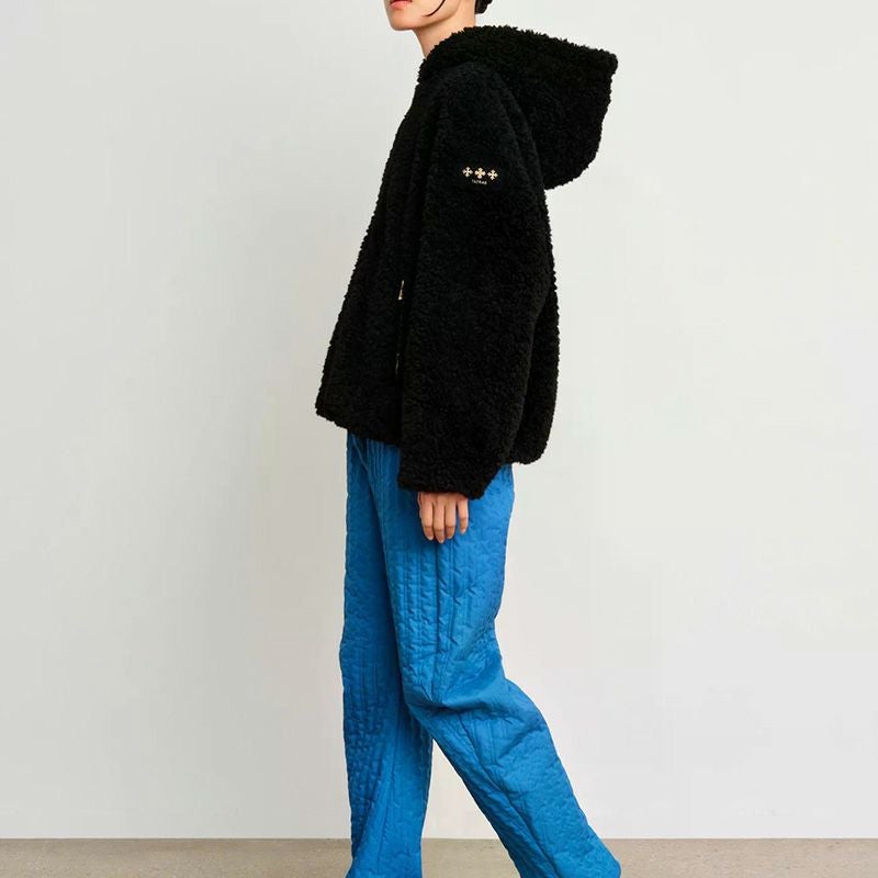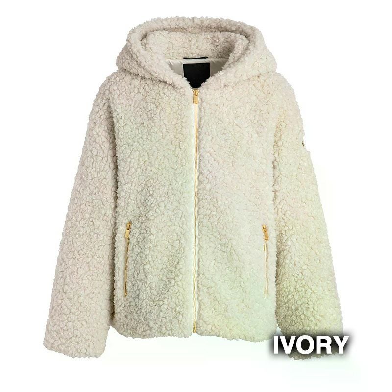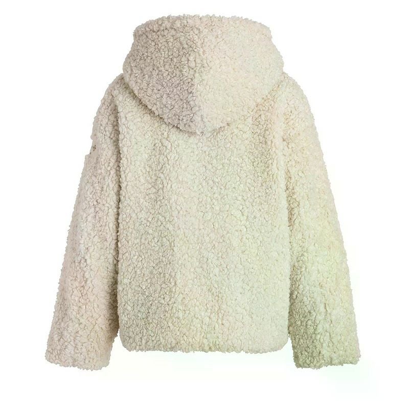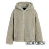 ポリエステル糸でウールライクな質感を実現させた、シープ調ボアのフード付きブルゾン。