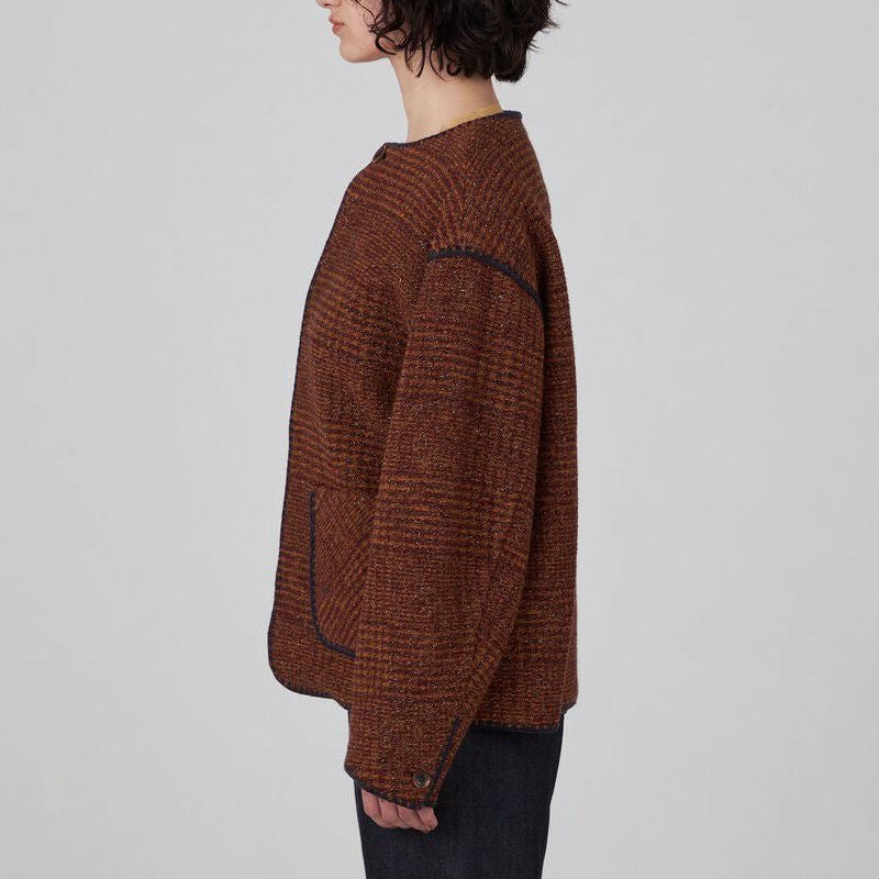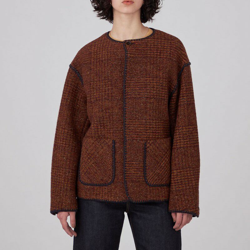 クラシックなチェック柄にラメ糸を入れ込むことで、トレンド感のある表情に仕上がっています。ふんわりとしたエアリー感と軽さで保温性が高く、着心地の良さも抜群です。
