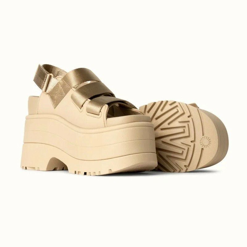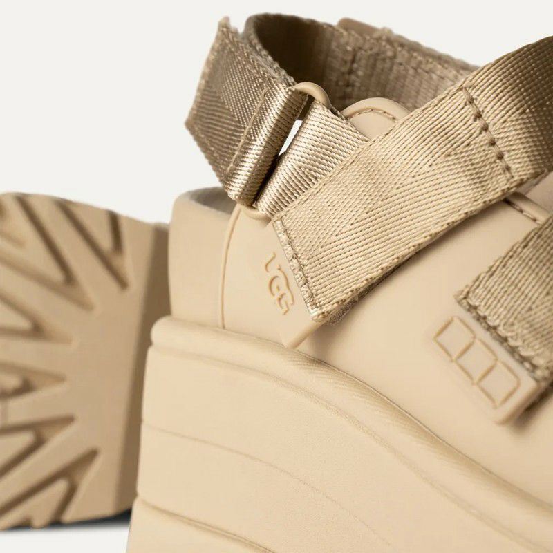 履く人が輝けるようにという想いを込めて作られたGoldenRiseは、100%リサイクル・ポリエステルのストラップが特徴で、足の甲の部分も調節可能で、バックストラップは足首に巻き付けたり、短いスリングバックに交換したり、完全に取り外してスライドサンダルにしたり3通りのアレンジができます。約11.4cmのヒールと厚さ約8.2cmのプラットフォームでヒールが高くても歩きやすく、つま先のソール部が上がっているデザインで、足運びの良さも特徴です。