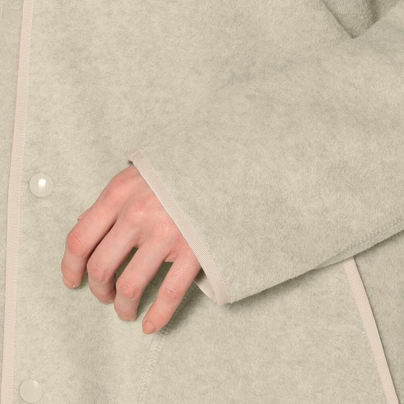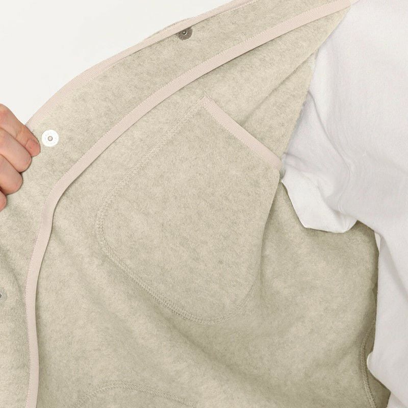 保温性と伸縮性に優れた両面起毛のフリースを使用しており、柔らかく滑らかな素材になっております。ポリエステルとレーヨンの混紡素材ならではのふっくらとした柔らかなさが特徴で、カーディガン感覚で気軽に羽織れます。