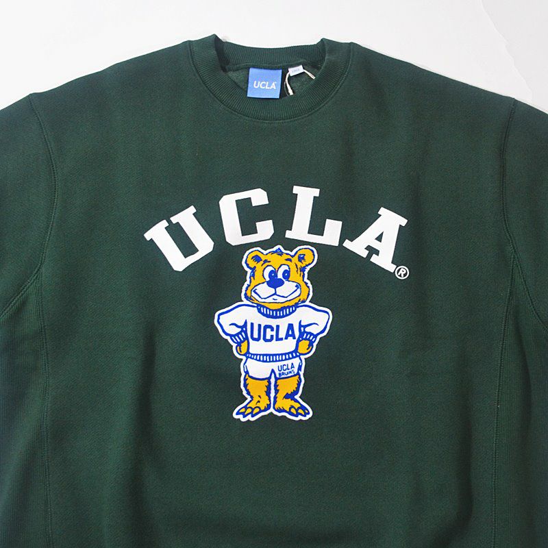 フロントとバックにあしらったカレッジプリントが目を惹くクルーネックスウェット。フロントはUCLAのマスコットのベアーが正面を向いていて、バックフロントはベアーも後ろを向いている遊び心のあるデザインに♪