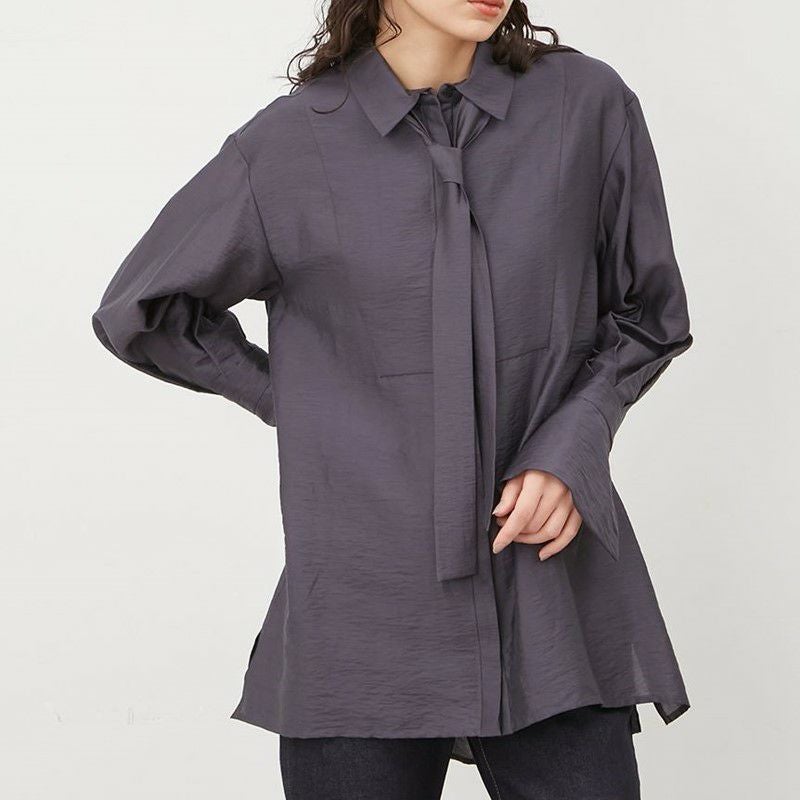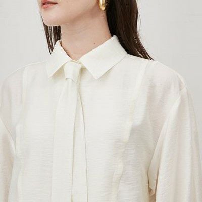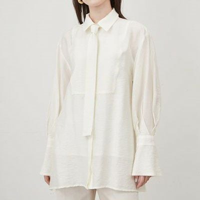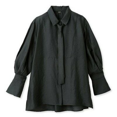 トレンドのネクタイデザインがメンズライクになり過ぎないよう、柔らかな素材でフェミニンさをプラスし、着やすいようにこだわったブラウス。程良く光沢感のある素材は華やかで上品な印象に。