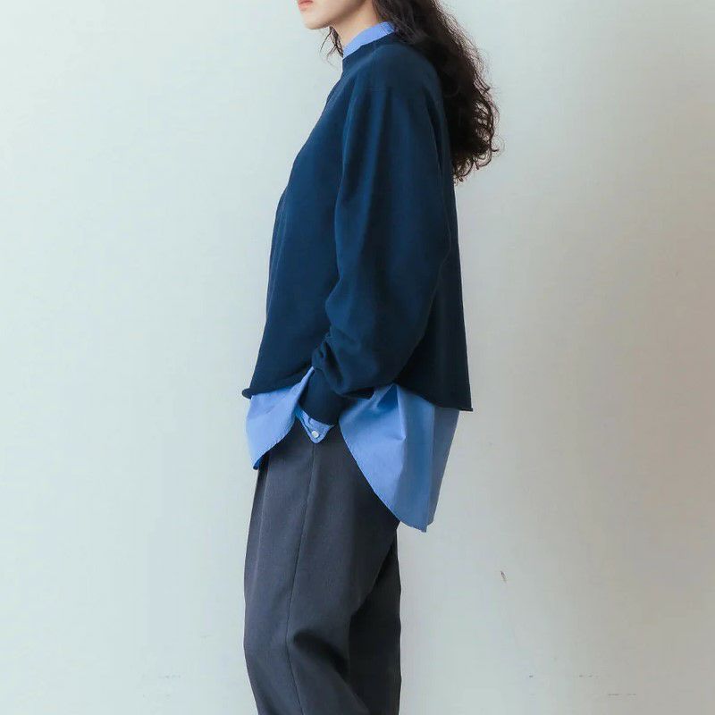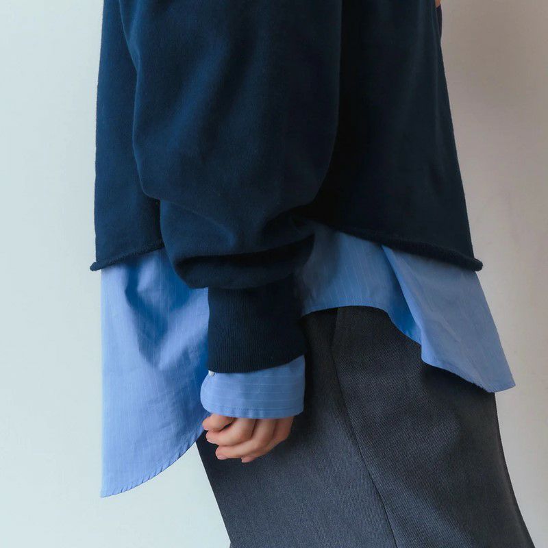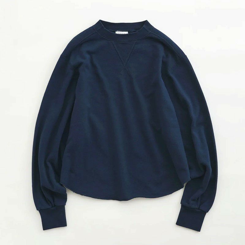 インすることを前提に作っているので、裾にはあえてリブをつけず、ボトムの中で生地がごわつくのを軽減しています。ラウンドカットされた裾はロック仕上げでアウトスタイルでもこなれ感のあるスタイルで合わせられます。