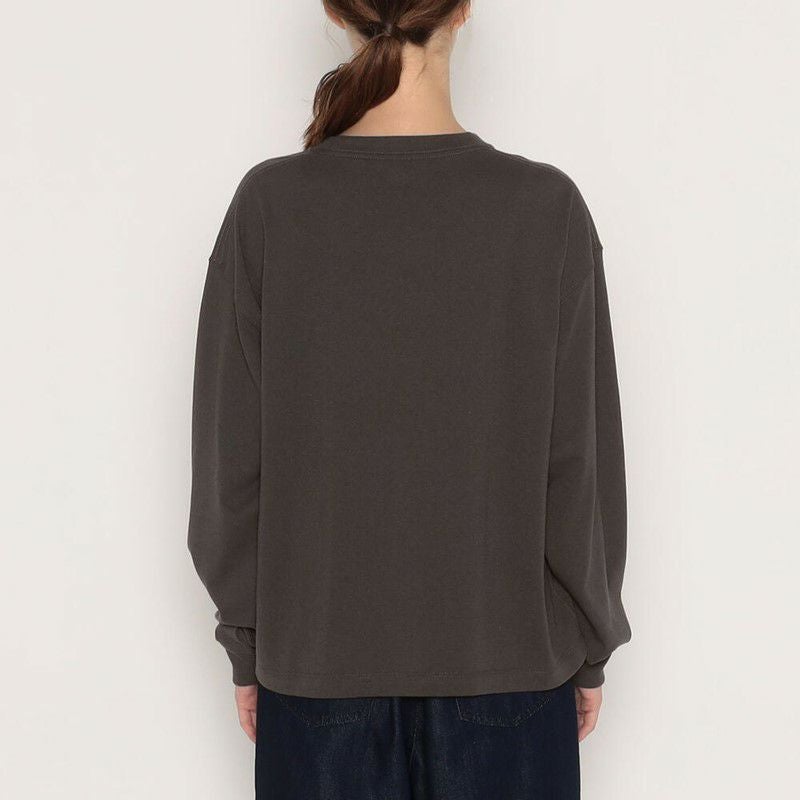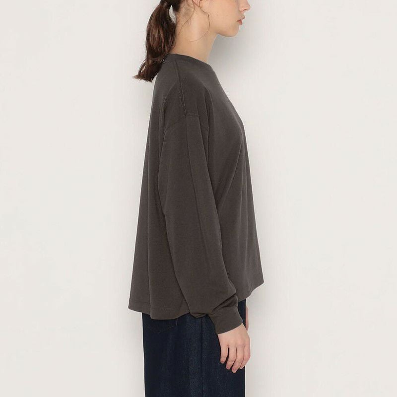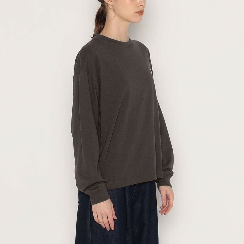 綿100%の空紡天竺のようなしっかりとした風合いを残しながら、ポリエステルの軽さと機能性を兼備した混紡素材を使用。硬すぎず、柔らかすぎず、快適な着心地を実現。ルーズな印象のやや長めの袖に、袖口のリブでメリハリをプラス。