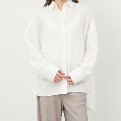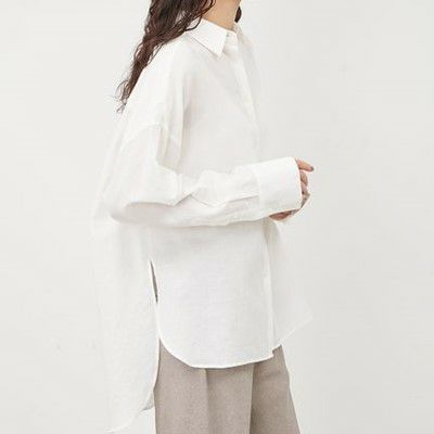 サイドのハイスリットとテールデザインがポイントのオーバーシャツはシアー感のあるフレンチリネン混を使用することで、上品かつ清涼感ある印象に。