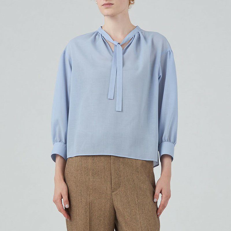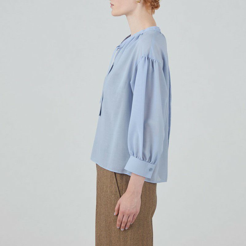 糸を強撚することでさらっとしたタッチながらもハリ感のある風合い仕上がっています。ブラウスはマニッシュな素材を使用しつつも、襟ぐりや袖口に寄せたギャザーが生み出すふんわりとしたフォルムでフェミニンな印象の一着。