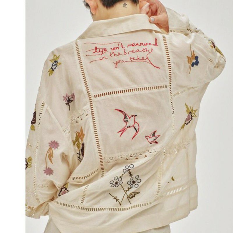 13種類もの刺繍をふんだんにあしらったパッチワークが目を惹く開襟シャツ。インドで一枚一枚に刺繍をあしらい、柄の配色や袖口のディテール等細部にまでこだわりの詰まった