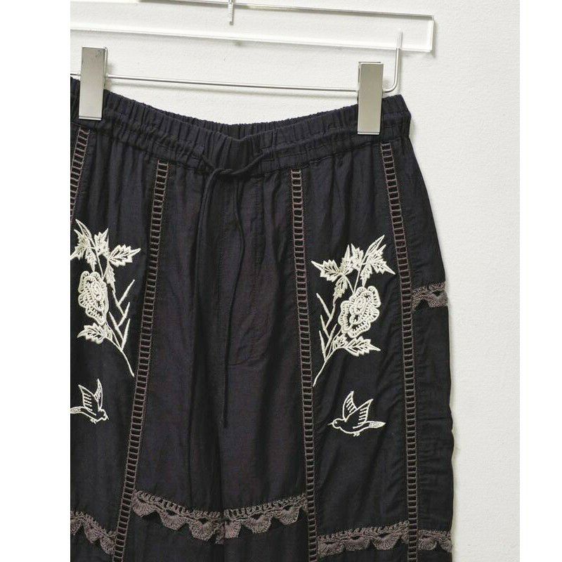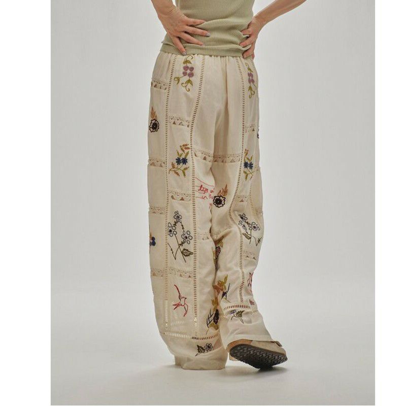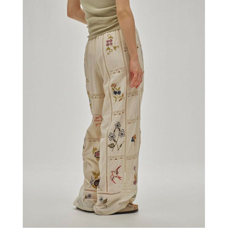 13種類もの刺繍をふんだんにあしらったパッチワークが目を惹くトラウザーズ。インドで一枚一枚に刺繍をあしらい、柄の配置や配色、パッチワークの入り方など、こだわりの詰まったアイテム。シンプルなトップストに合わせるだけでこなれた印象に。足元はフラットなサンダル合わせがおすすめです。