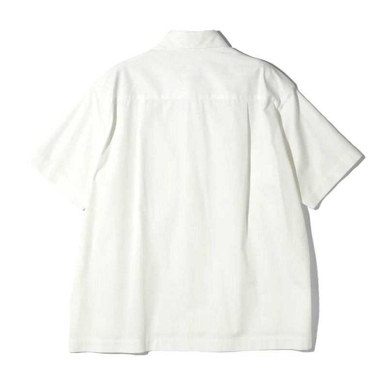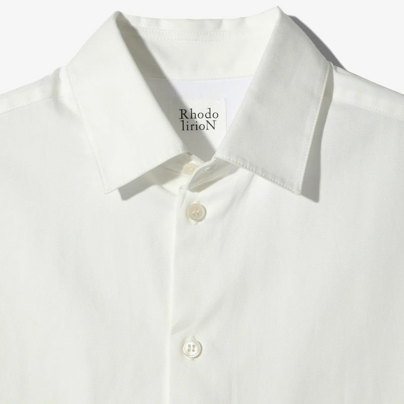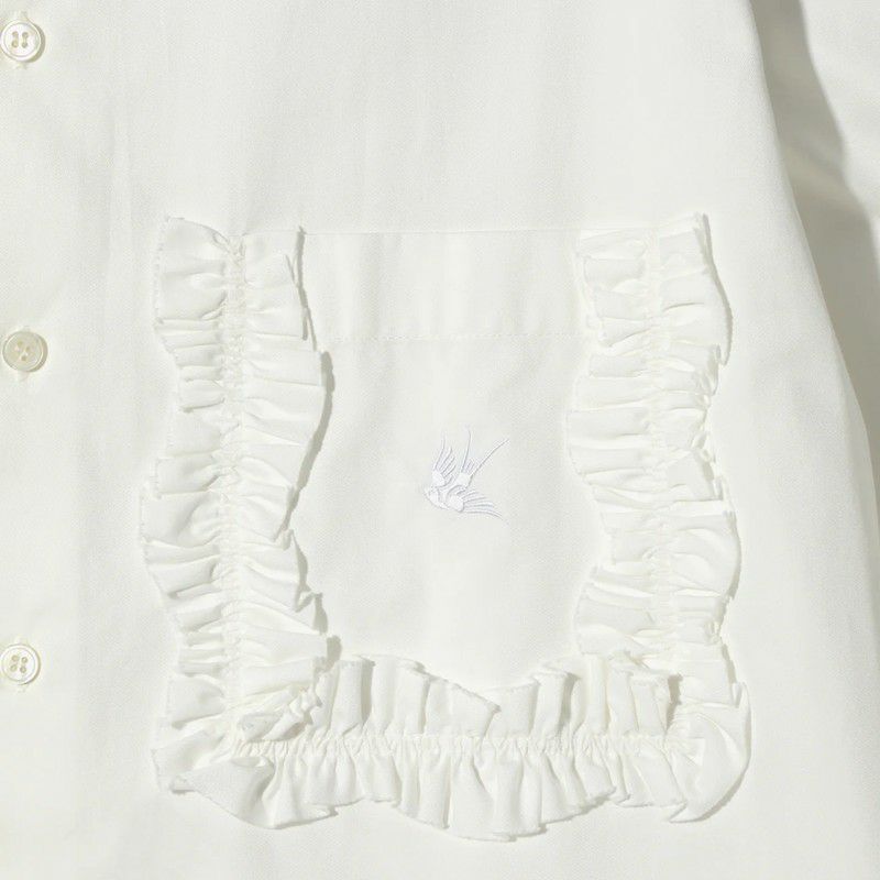 <RHODOLIRION>のシグニチャーでもある大きなフリルパッチポケットが特徴の新作レギュラーカラーシャツ。