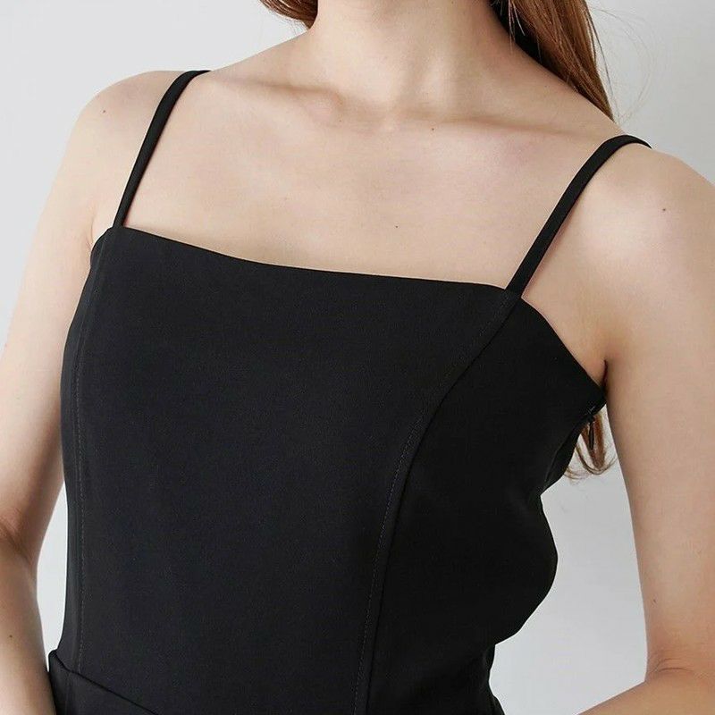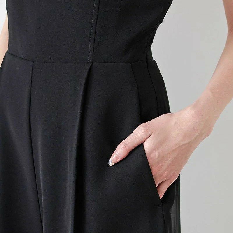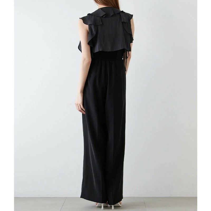ラッフルフリルを重ねたフェミニンな印象のふんわりシフォンボレロに、シルキーなツイルダブルクロスを使用してお作りしたエレガントなコンビネゾンを合わせたセットアイテムがお目見え。コンビネゾンのバックには、ゴムシャーリングを利かせて、動きやすさをキープしながらシルエットを美しく見せてくれます。フィット感のあるコンビネゾンですが、タテヨコに伸縮性があり、快適な着心地も兼ね備えています。サイドにはポケットが付いており、肩紐はアジャスターで調節いただけます。サイドのファスナーで着脱いただけるアイテムです。フリルが華やかなボレロはシボ感のある軽やかなシフォン生地を使用しました。フロントの2本のリボンで着脱いただけます。コンビネゾンとセットでご着用いただくと、キレイめなコンビネゾンにややカジュアル感のある柔らかなボレロが今季らしい抜け感をプラスします。コンビネゾンとボレロの色のコントラストやシルエットでスタイリングにメリハリが出せて、スタイルアップ効果も期待大です。コンビネゾンはジャケット合わせにもおすすめ。単品でもそれぞれ活用しやすいアイテムです。