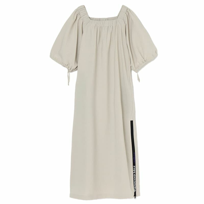 Iラインシルエットが体型を拾いにくいのも嬉しいポイント胸元や肩回りはゴムギャザー入り。