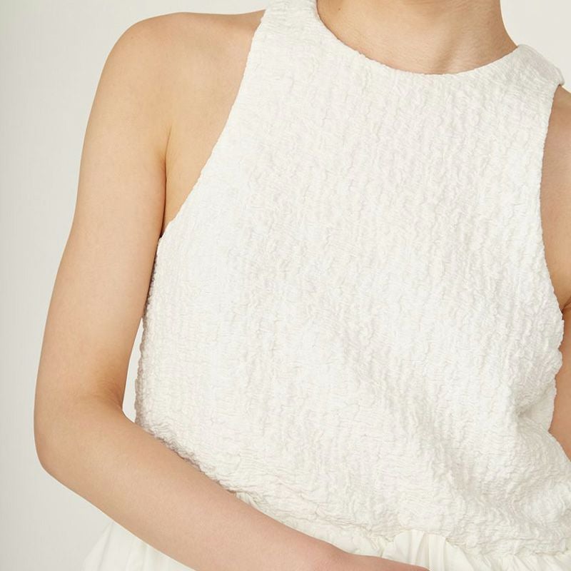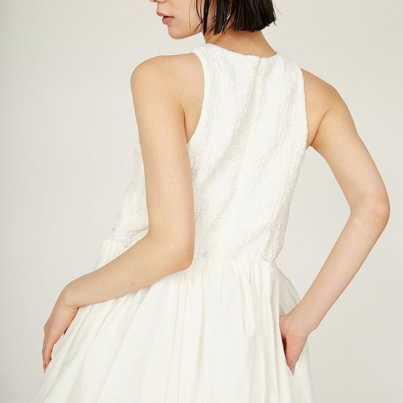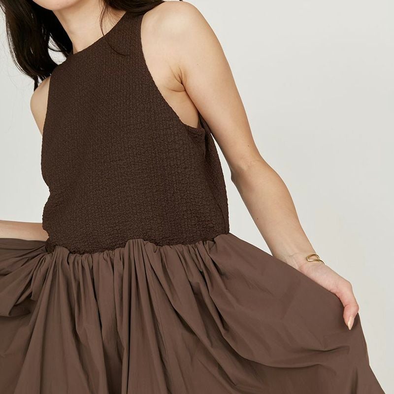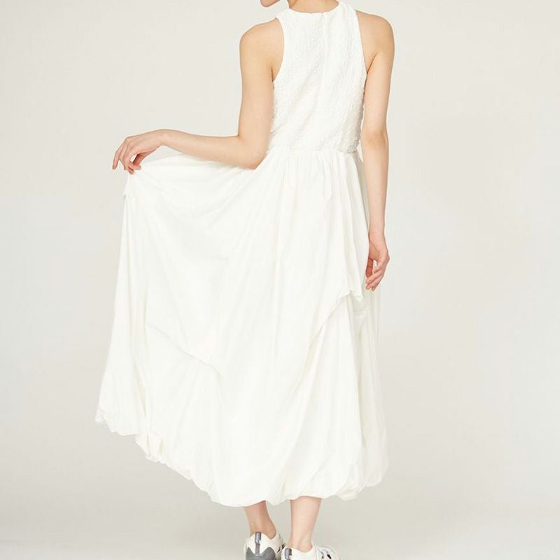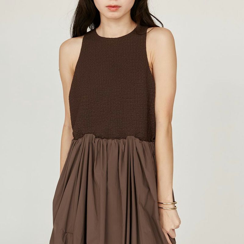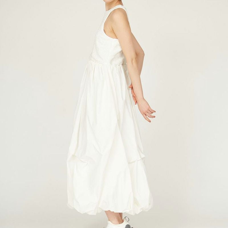 ポコポコとした表面感のある生地とシャリ感のあるナイロン生地を組み合わせたドッキングワンピース。スカートはドライタッチで軽い素材なので真夏でもサラッと着ていただけます。