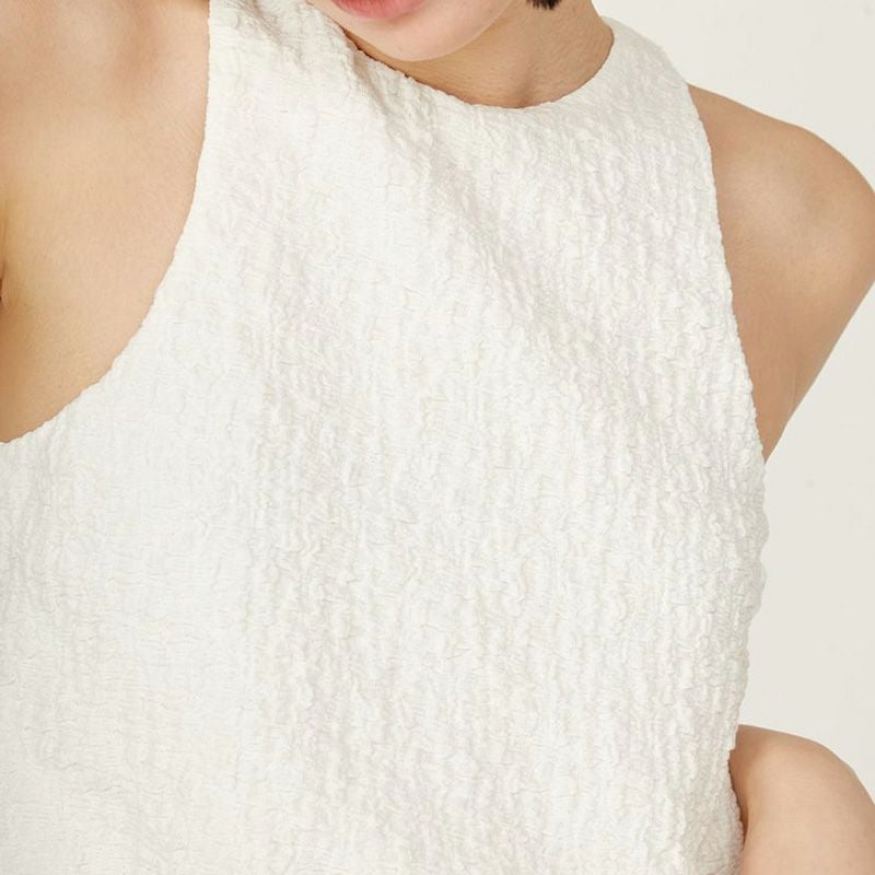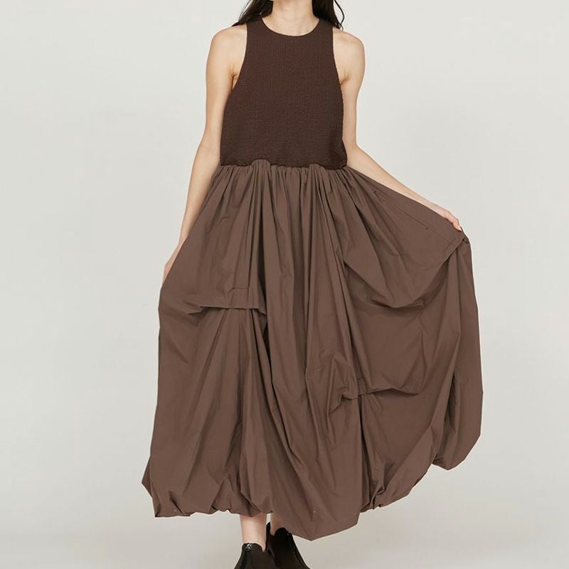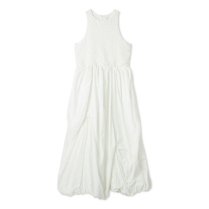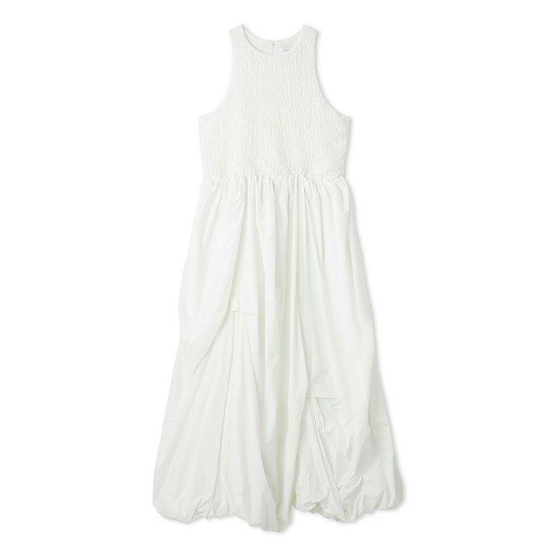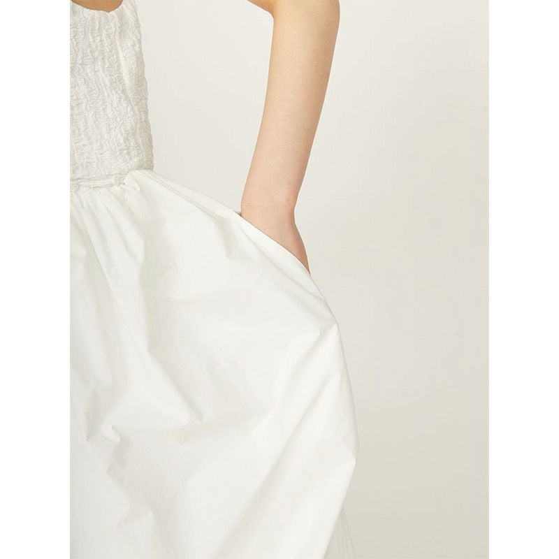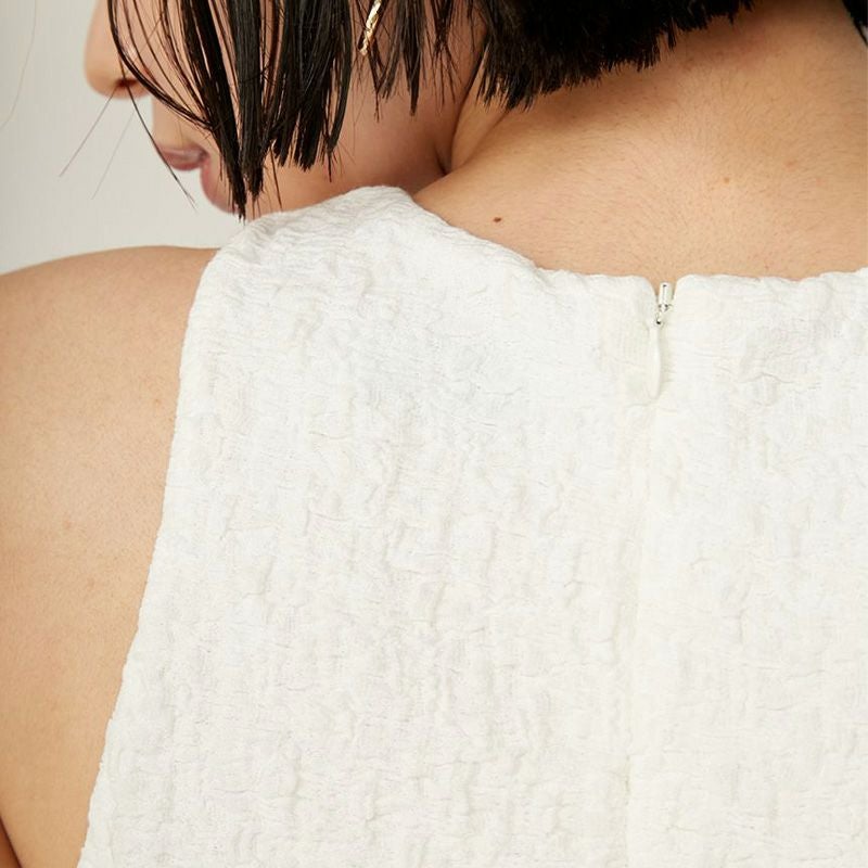 ポコポコとした表面感のある生地とシャリ感のあるナイロン生地を組み合わせたドッキングワンピース。スカートはドライタッチで軽い素材なので真夏でもサラッと着ていただけます。
