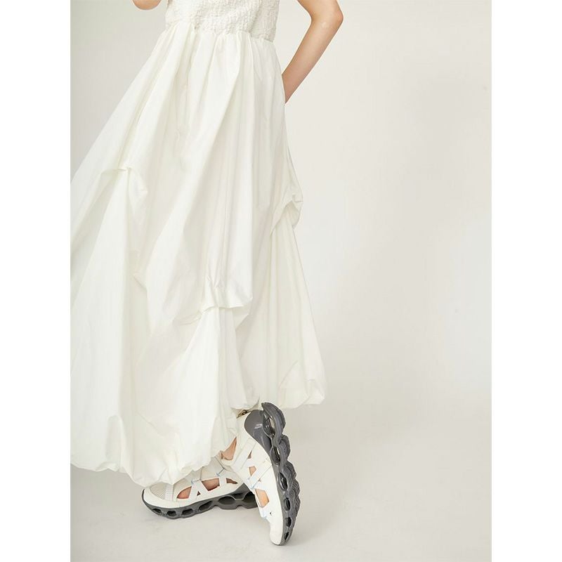 女性らしいデザインのワンピースの、スカートはナイロン素材の生地であえてスポーティーにしているので、キャップやスニーカーなどにも相性抜群です。フェミニンに合わせてもカジュアルにも合わせても小物で雰囲気を変えることができます。