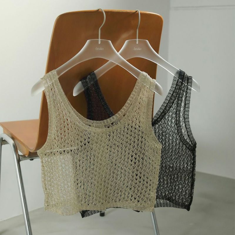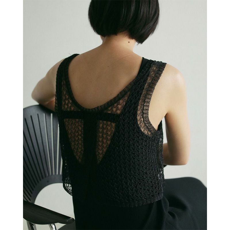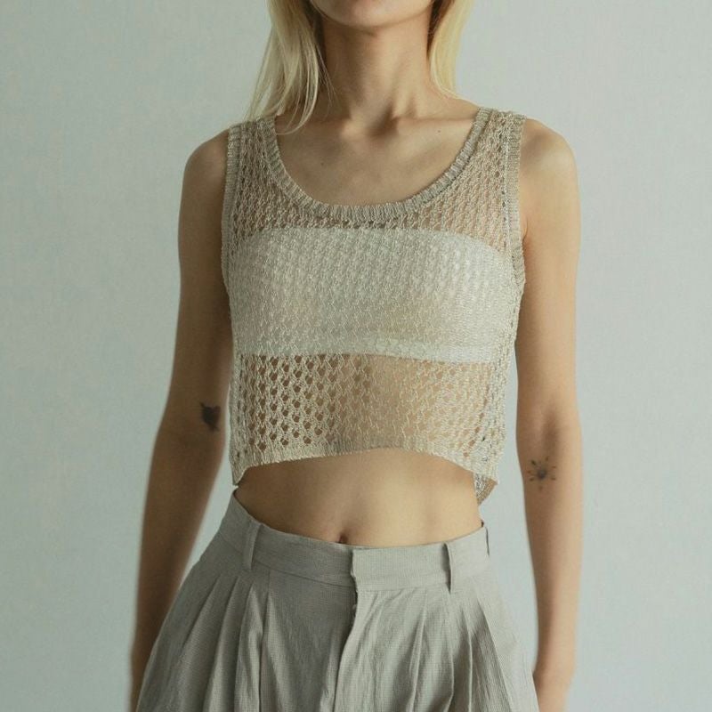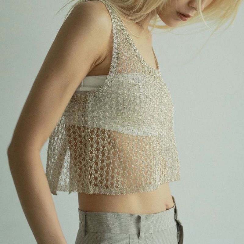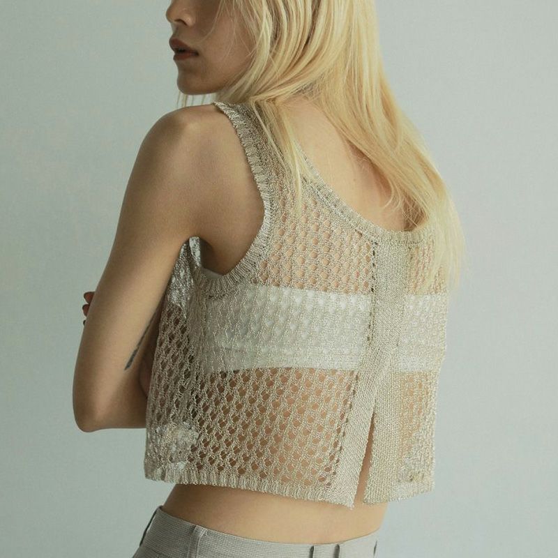 メタリック糸を使用したメッシュ編みニットトップス。ハリのある細番手のメタリック糸で、シャリ味のある風合い。ベアトップなどと合わせてシアー感を楽しんだり、シンプルなTシャツやワンピースの上にレイヤードするのもおすすめ。フラットな素材のアイテムと合わせるだけで、コーディネートに奥行きが生まれ、スタイリングが新鮮に見える一枚です。