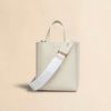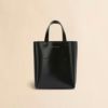 カーフレザー製 North/South トートバッグ、ミニサイズ、内側にスロットポケット付き。 内側に布製巾着ポーチ付き。 レザー製トップハンドル。 取り外し・調節可能なリサイクルテープ製ショルダーストラップにはマルニレター入り。 単色デザイン。 ゴールドトーンのメタルパーツ。 外側にゴールドのロゴプリント。