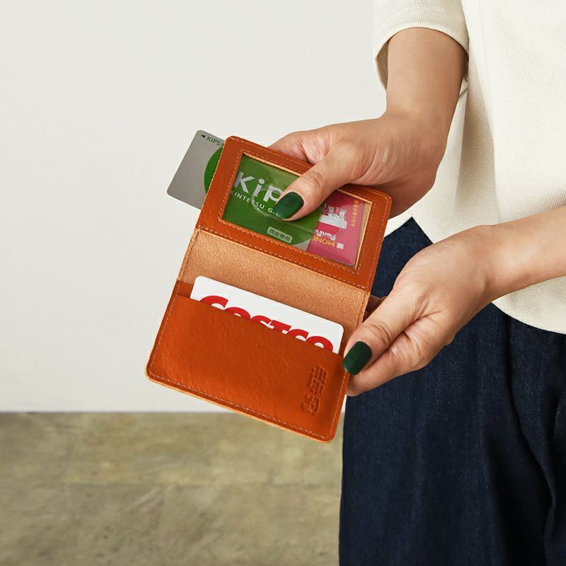 シンプルなデザインの2つ折りパスケース。内側にはカードケースもあるので使い勝手が良く、贈り物にも喜ばれるアイテムです。2つのカード収納に加えて、クリアーフィルムのポケット仕様で、指でカードを押し出せるデザインになっています。