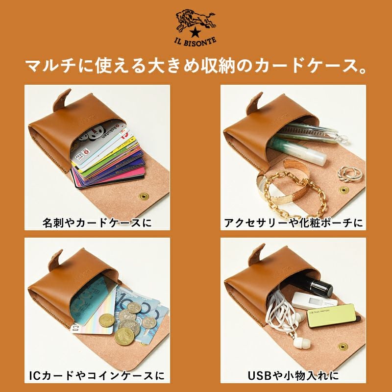 ストラップがアクセントとなったシンプルなカードケース。オリジナルレザーの1枚仕立てになっており、内側は仕切りを排したシンプルな作りとなっています。マチが広くとられているので、たっぷりの容量。カードや名刺だけでなく、コスメやモバイル小物にも。シンプルな中にフタとボタンにはお馴染みのバッファローの刻印がポイントになっています。