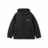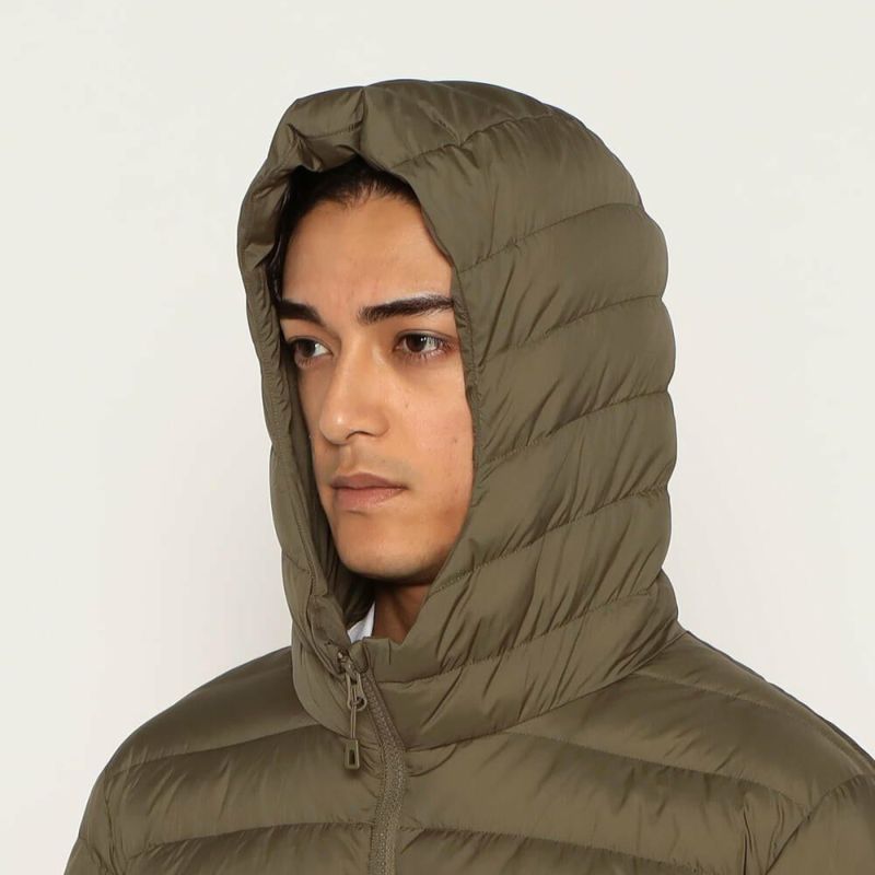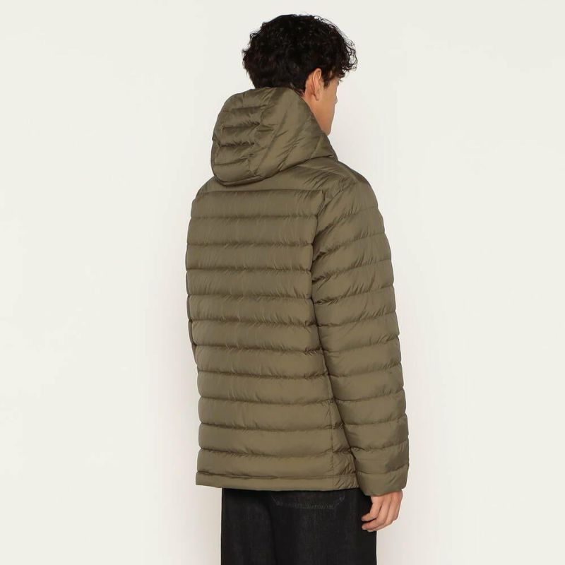 スリムシルエットのメンズ ナイロン タフタ ミドルダウン フーデッドジャケット。