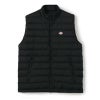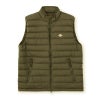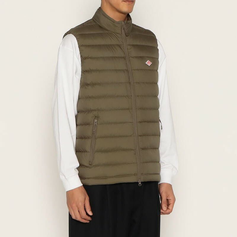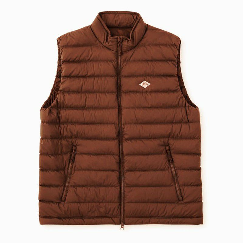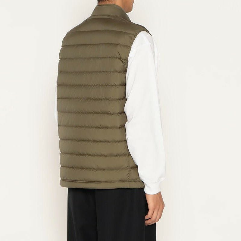 低めのスタンドカラーで首周りがスッキリ見える、スタンドカラーダウンベスト。