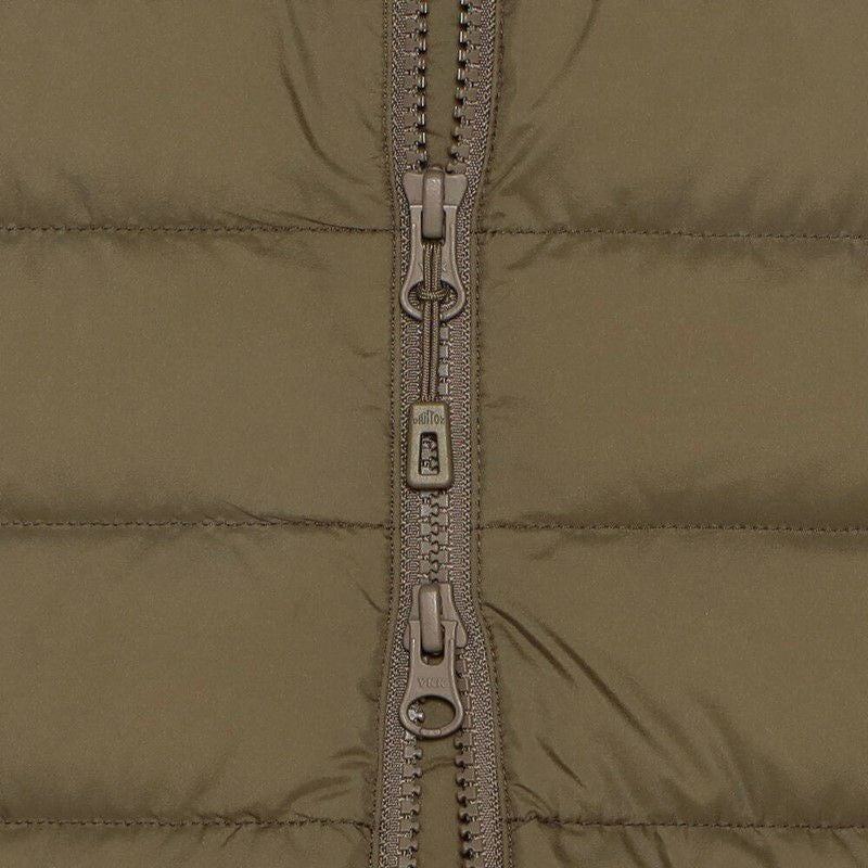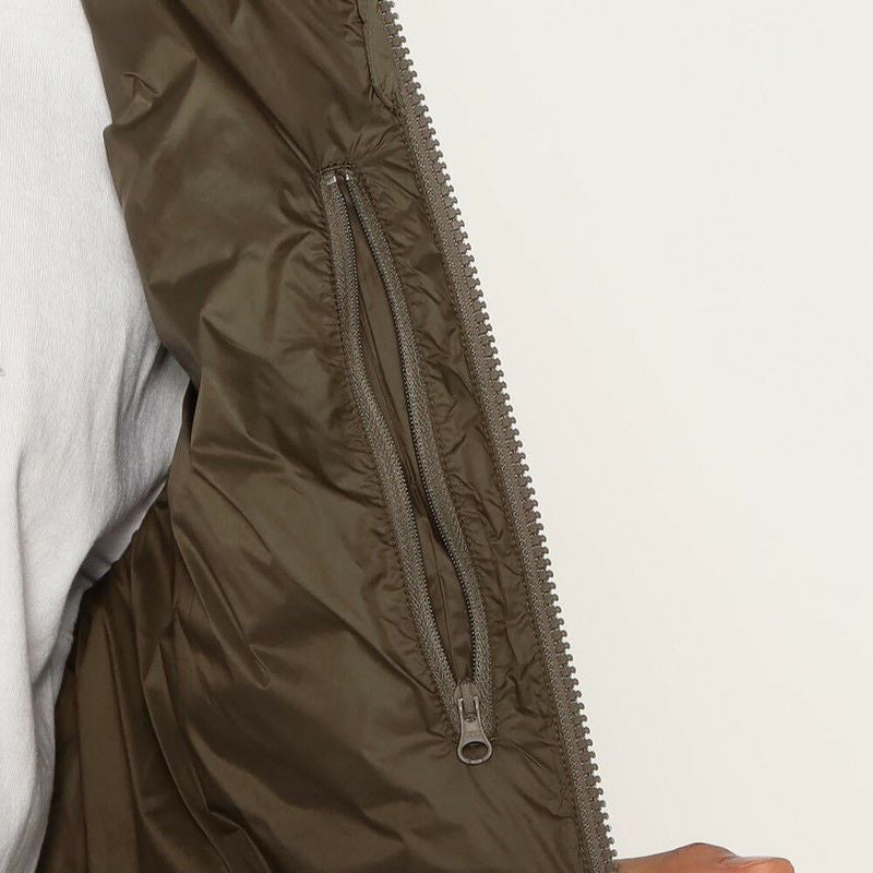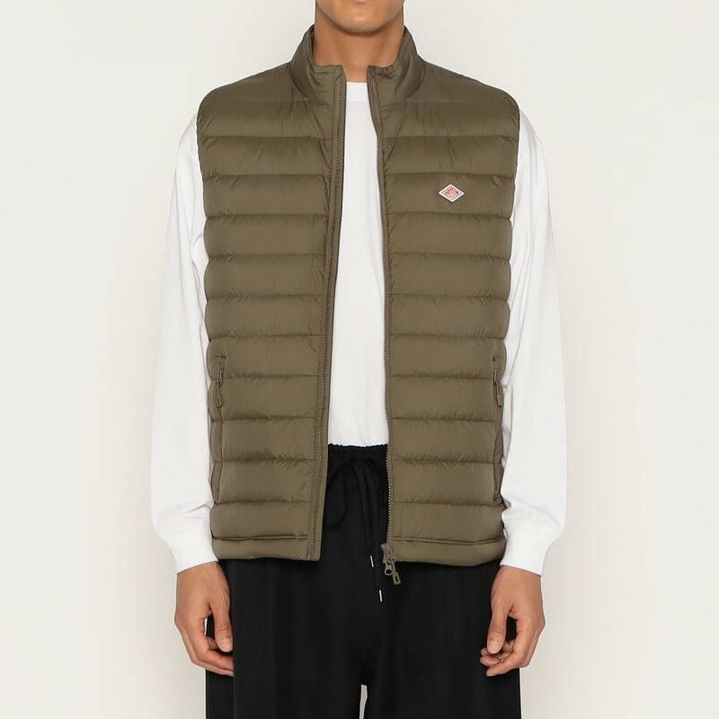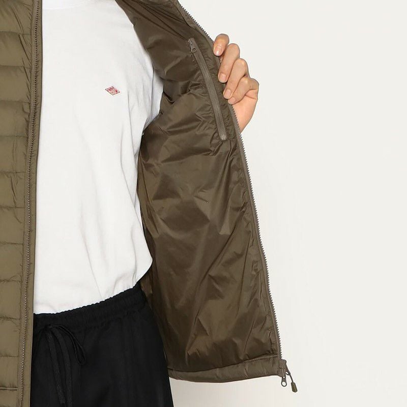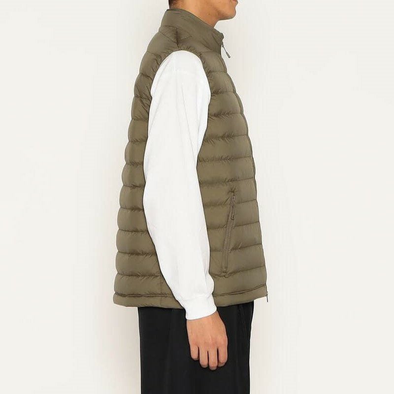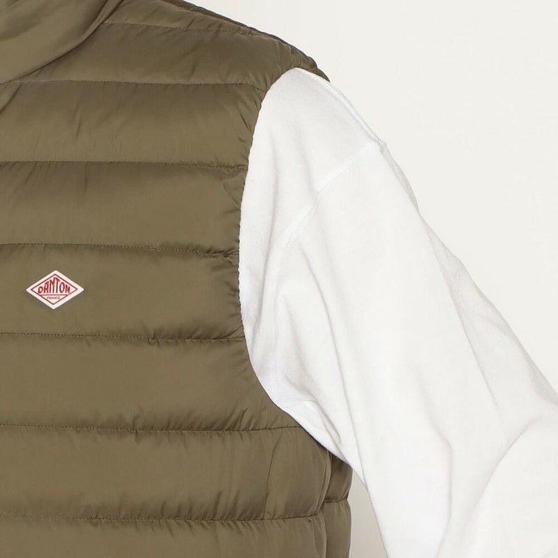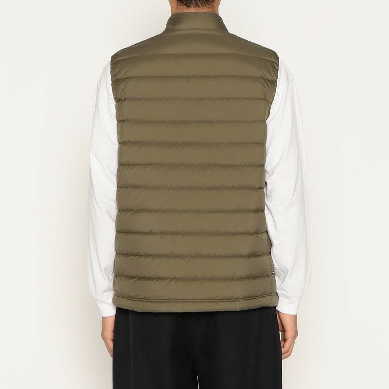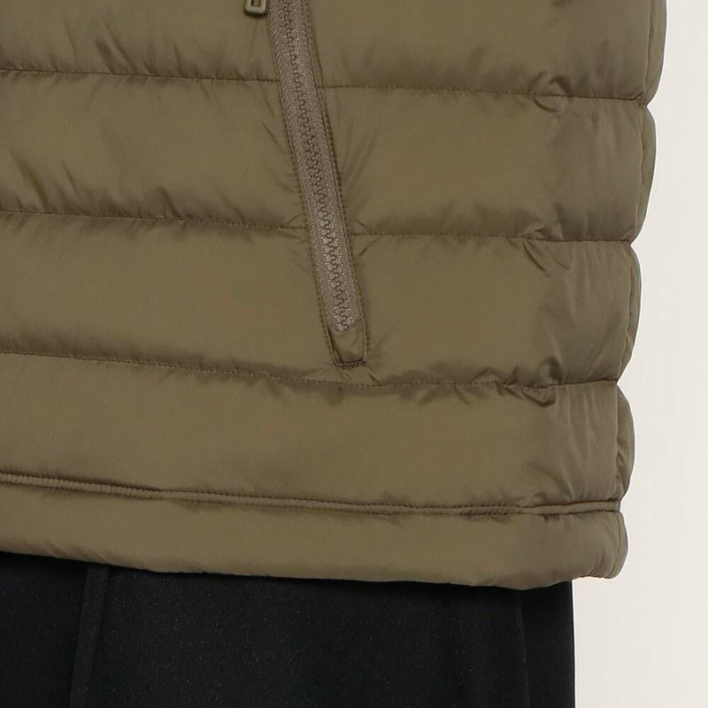 マットな風合いと柔らかな手触りが特徴のナイロンタフタを使用しており、シックな印象で着ていただけます。インナーダウンよりも肉厚で、アウターダウンほど嵩張らない絶妙なボリュームで、スウェットやニットだけじゃ少し肌寒い、そんな時に活躍するミドルダウンベスト。