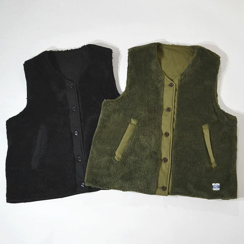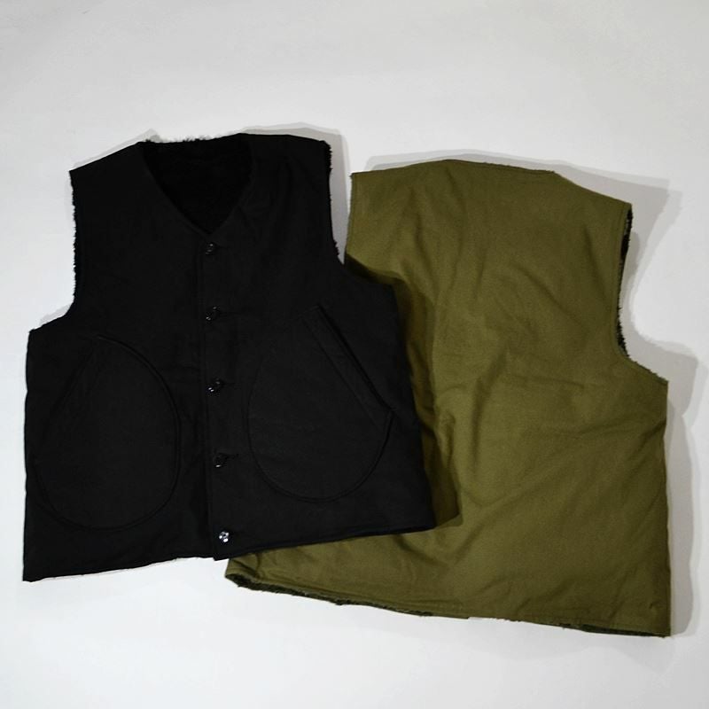 表裏で異なった素材感で雰囲気の全く違うデザインを楽しめるリバーシブル仕様のベスト。