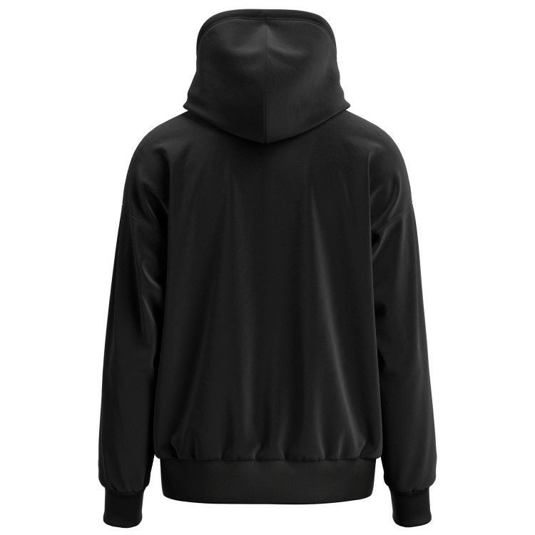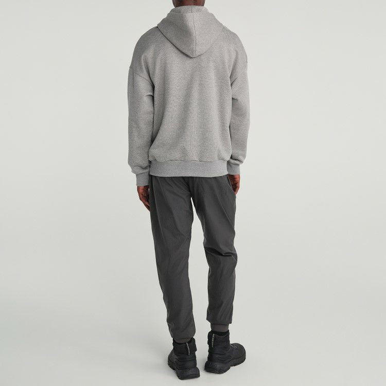 フードはスピンドルを省いたシンプルなつくり。胸のブランドロゴと袖口のクロスロゴがさりげなく高級感を添えています。