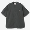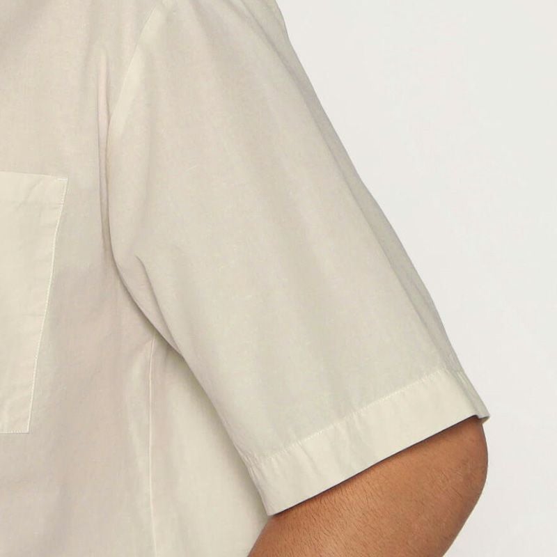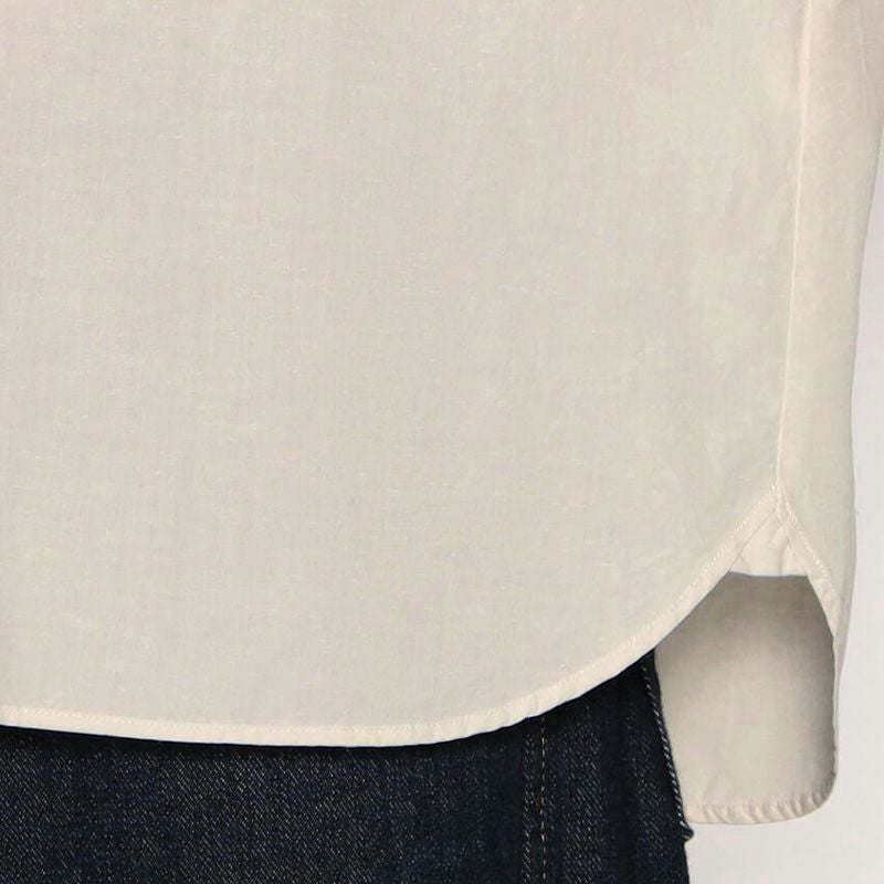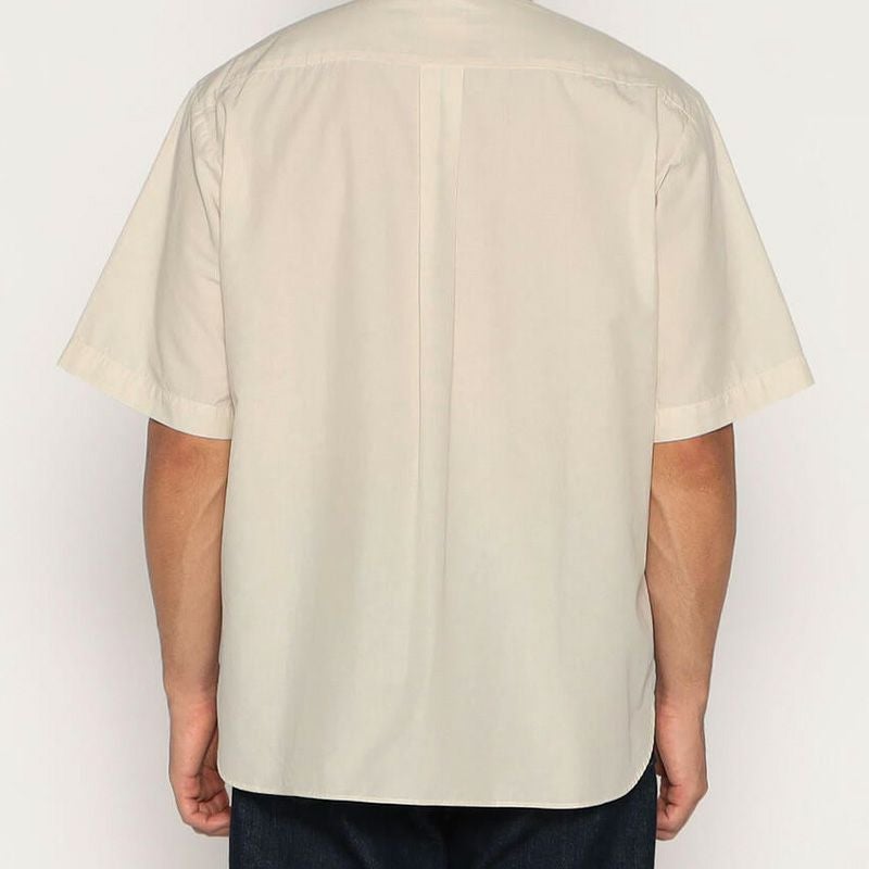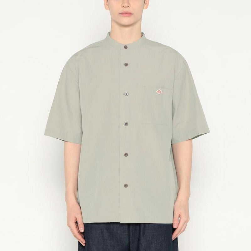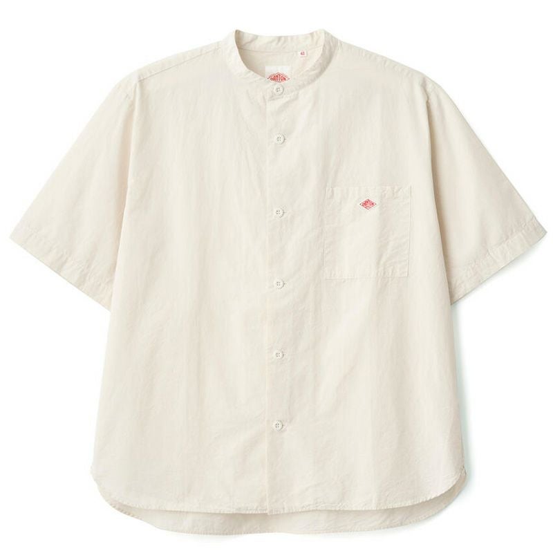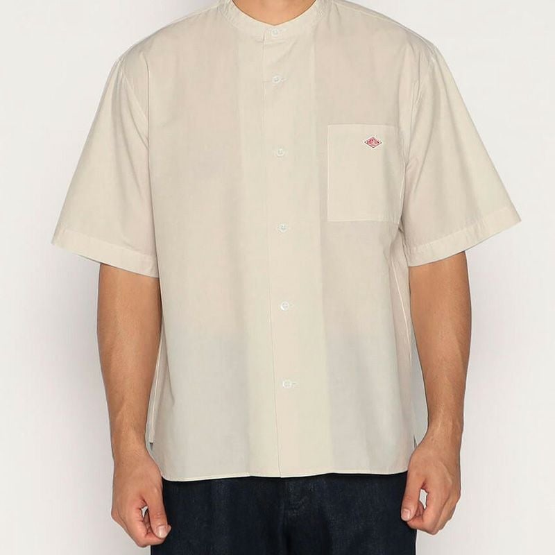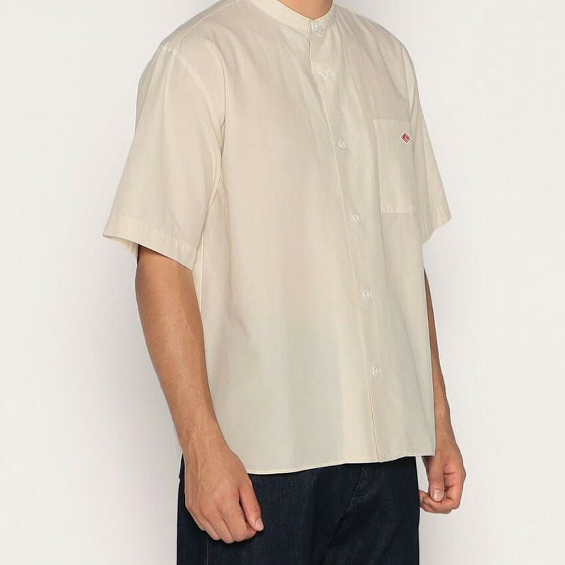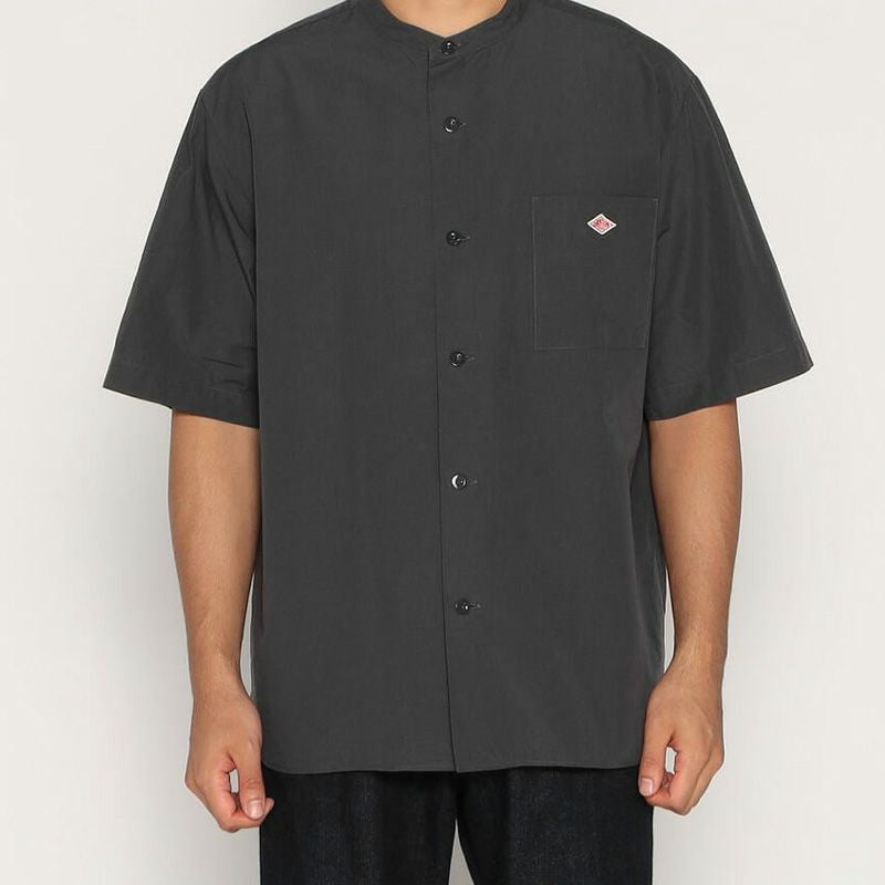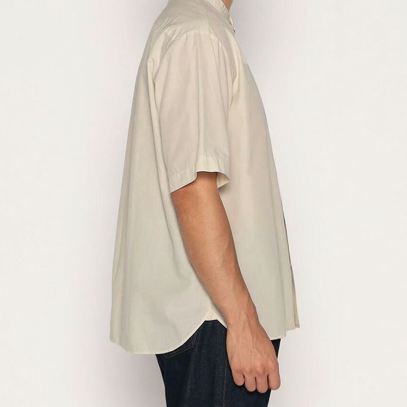 ・ゆったりとしたボックスシルエットの半袖バンドカラーシャツ