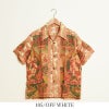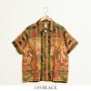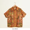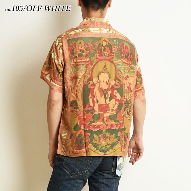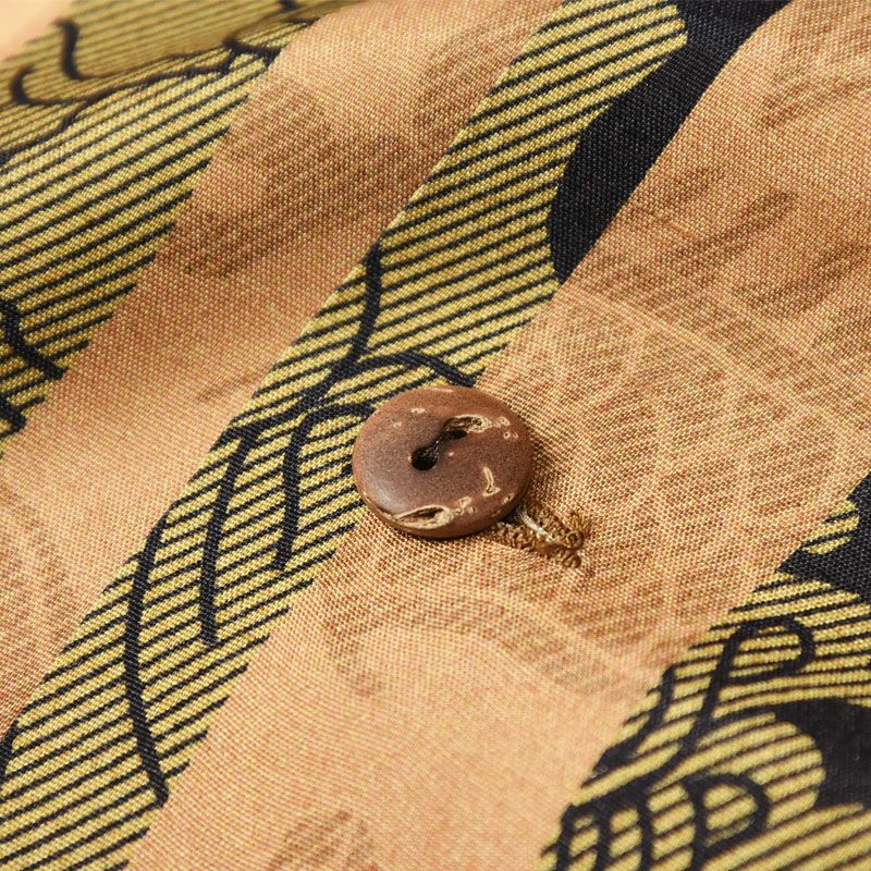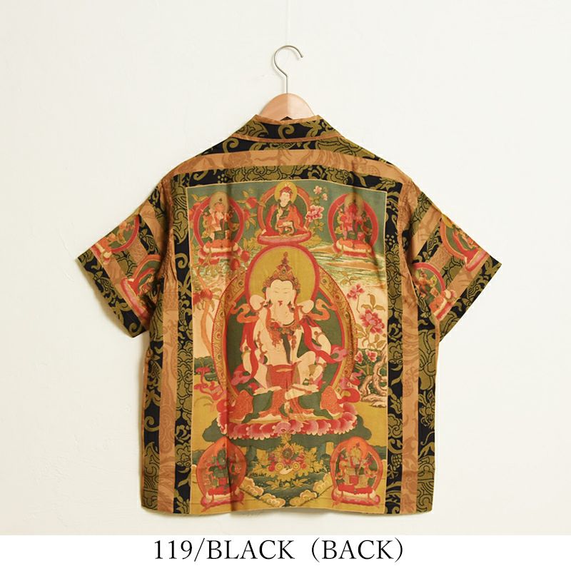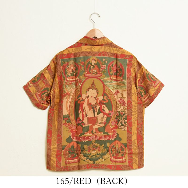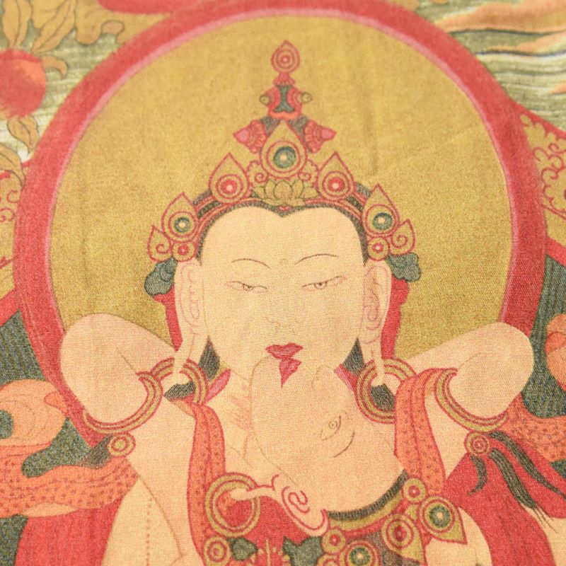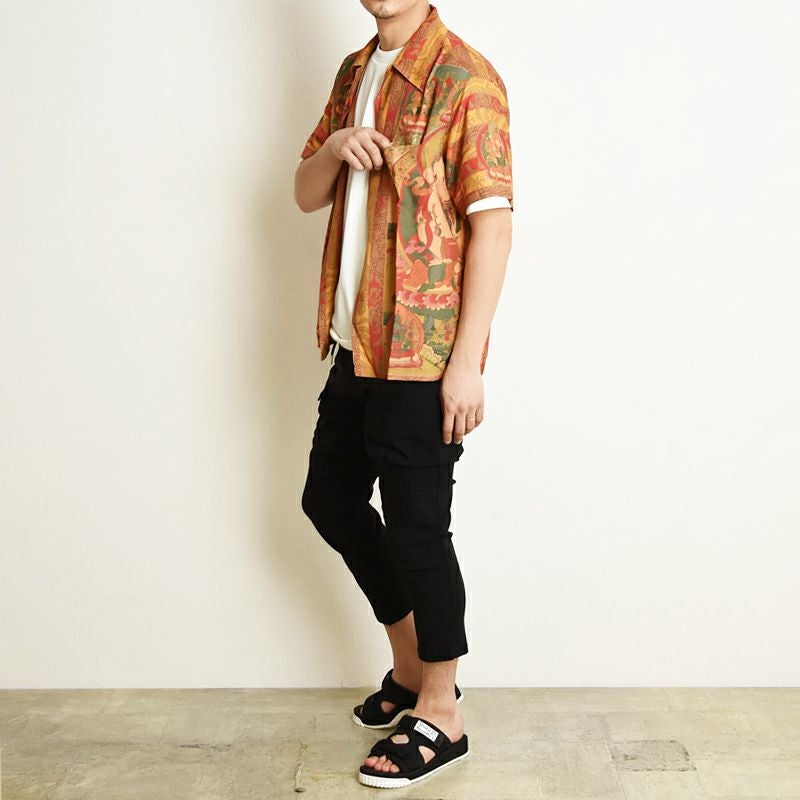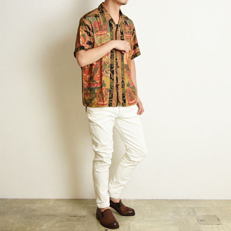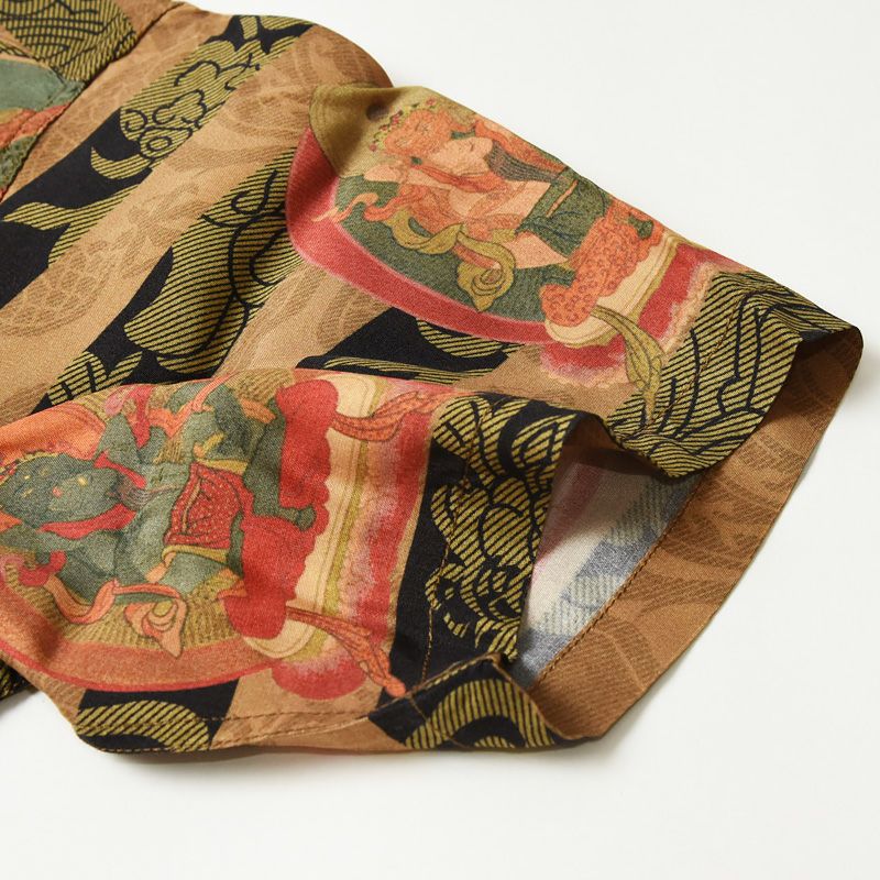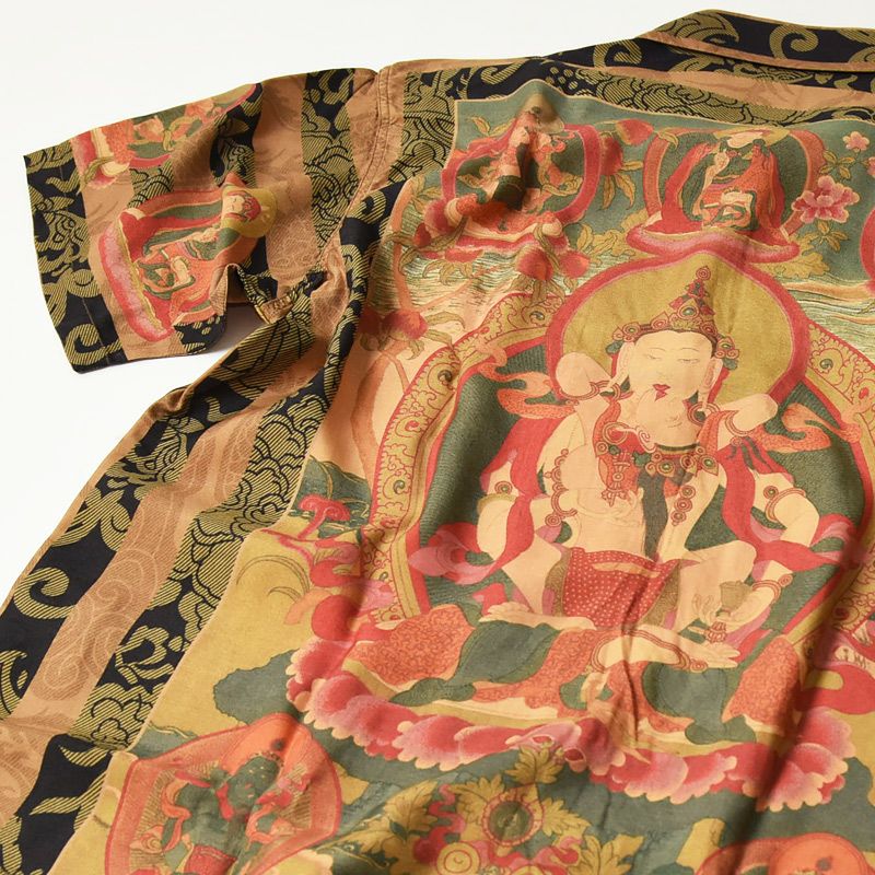 こちらは、1970年代に京都で捺染され、日系の商社トリプル・タイムス・カリフォルニア社によってアメリカ向けにシャツ用の生地として輸出されたデザインです。当時の資料は生地しか現存しておらず、シャツとして生産したメーカーやブランドはいまだに判明していません。しかし、緻密に彫られた型を幾重にも摺り重ねた完成度の高い生地であることから、熟練の職人による非常に優れた作品であることには間違いありません。デザインの元となっているのは「タンカ」と呼ばれるチベット仏教の掛け軸です。元々は僧侶が伝道の際に教義をわかりやすく解説するためのもので、この生地にもチベット密教の開祖である「パドマサンバヴァ」や男女両尊のシンボル「ヤブユム」など、チベットの仏教美術にみられるモチーフがプリントされています。作品名の「マンダラ」とは、サンスクリット語で円輪という意味を持ち、過不足のない充実した状態のことをさします。悟りの境地を示す図絵でもあり、神仏が集会(しゅうえ)する「曼荼羅」として日本の文化にも伝存しています。